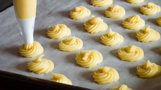 Dresser la pâte à choux avec une poche de pâtisserie douille n°10 sur plaque beurrées ou Téfal pour les petits choux ou éclairs, gros choux, et dorer les pièces à l’aide d’un pinceau trempé dans un œuf battu, puis à l’aide d’une fourchette les rayer sur le dessus.